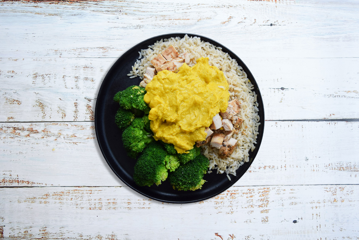 Chicken breast, Montreal seasonings, cream corn (gluten free flour – garbanzo bean flour, potato starch, tapioca flour, white sorghum flour, fava bean flour -, vegan butter, house made veggie stock, coconut milk, nutritional yeast, corn, onion, turmeric), brown rice, broccoli, herbs & spices