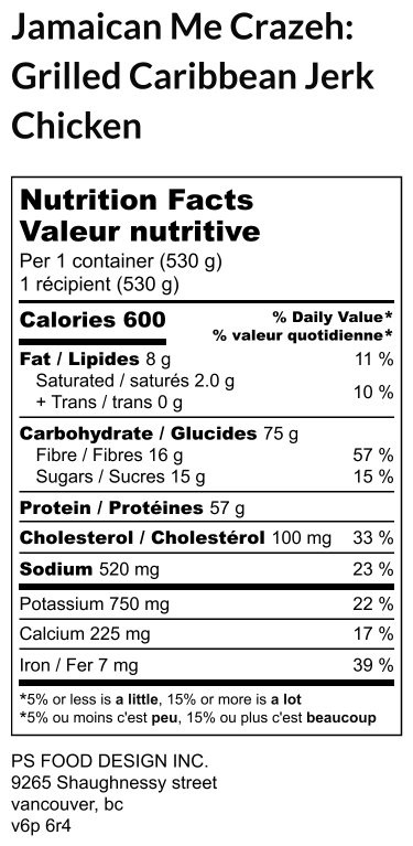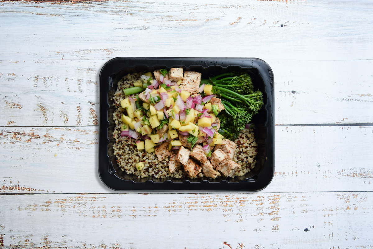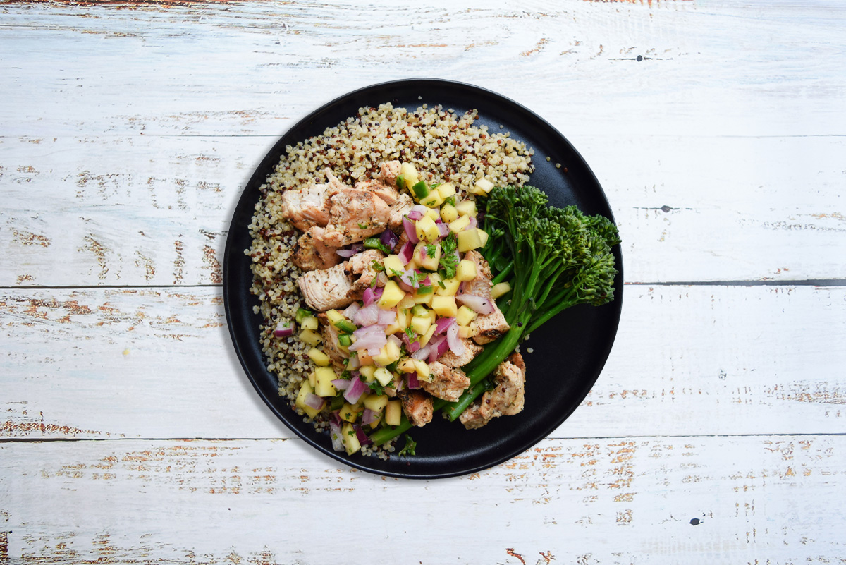 Chicken breast, jerk seasonings, organic tricolour quinoa, broccolini, house made mango salsa (mango, red onion, cilantro, jalapeño, lime juice, salt, black pepper), herbs & spices