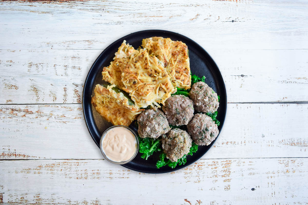 Keto Meatballs (lean ground beef, parsley, Spanish onion, coconut milk, eggs, cayenne pepper, salt, mustard powder), Zucchini “fries” (zucchini, mozzarella cheese, eggs, oregano, garlic, paprika, black pepper), kale, house made chipotle aioli (egg yolk, dijon, lemon juice, apple cider vinegar, chipotle peppers, filtered water), herbs & spices