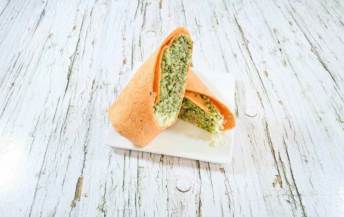 Our delicious take on the classic steak and cheese wrap! AAA sirloin strips and brown jasmine rice tossed with our house made chimichurri aioli and shredded mozzarella inside of a 12 inch 3 cheese tortilla.